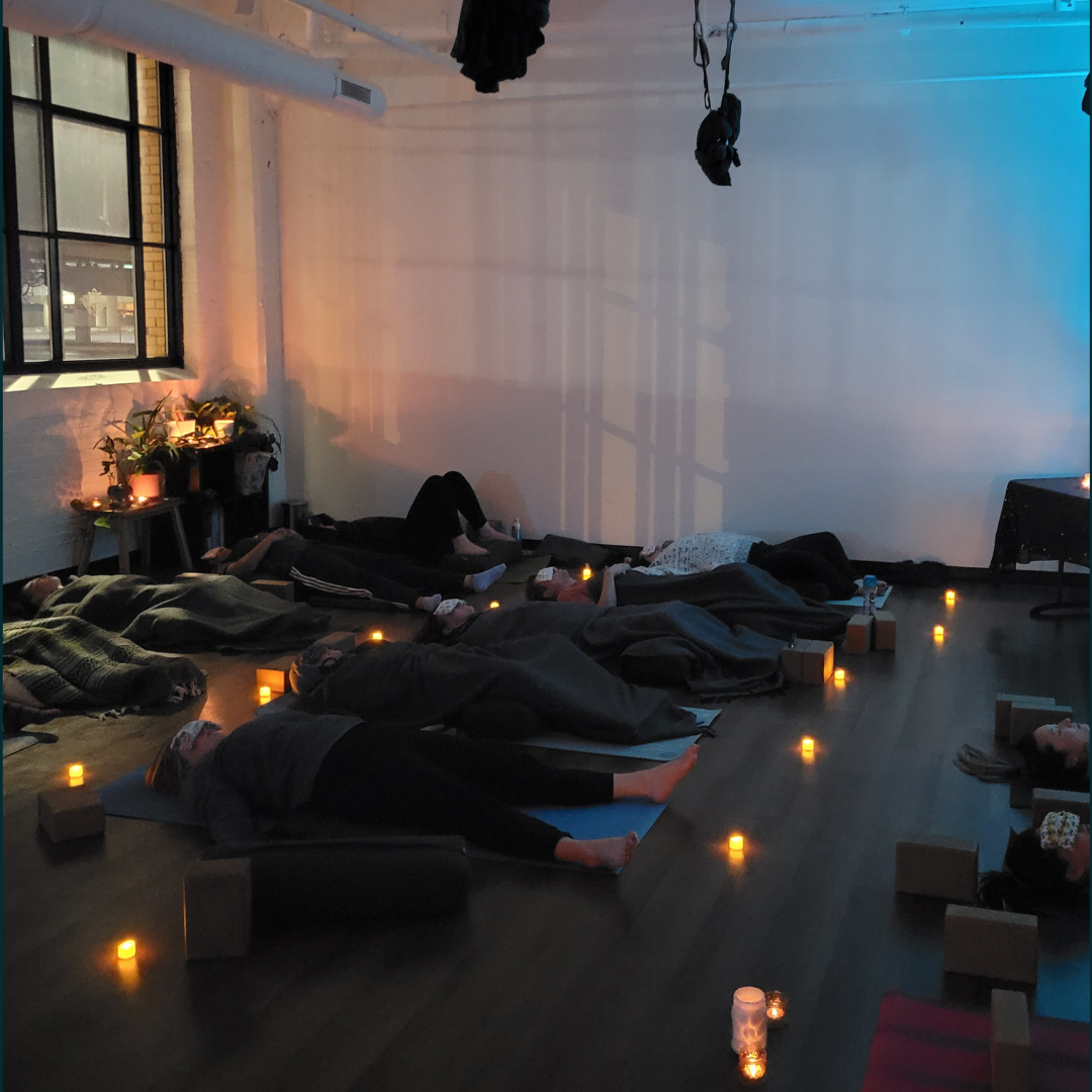 - Restorative Yoga: A guided practice of longer held relaxation postures fully supported by many props.